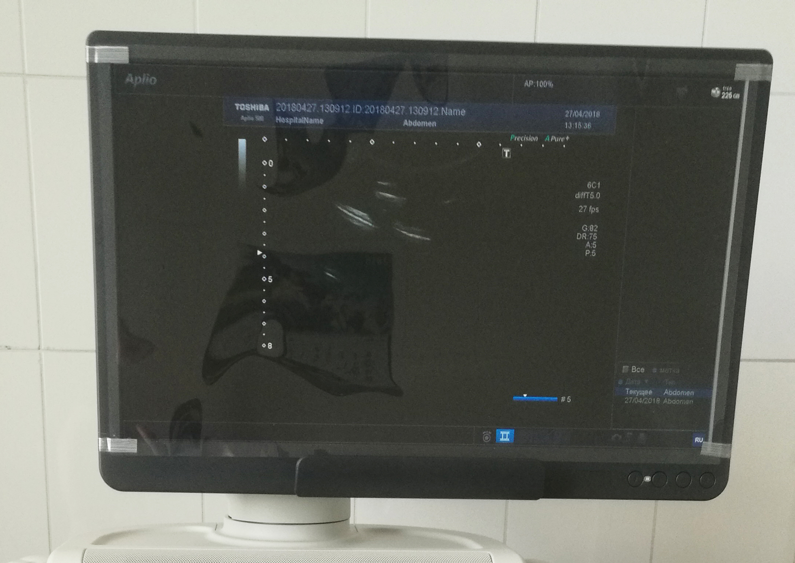 Каков он в работе? Сначала было непривычно, инверсия экрана на стандартных настройках. Это как с японскими автомобилями, настоящие всегда с правым рулем. Тут точно также, метка датчика с другой стороны экрана. Дело привычки, или нажатия кнопки инверсии на сенсорном экране. Есть инверсия при настройке окна интерфейса, трекбол вниз – уменьшает окно, опять же надо привыкнуть. Изображение в сером режиме, на удивление, красивое. Никаких квадратных пикселей на экране, все гладко, с плавными переходами. Глаза не устают. Скорее наоборот, хочется не отпускать пациента подольше – полюбоваться на эту красоту. Цветовой допплер дает сглаженные, плавные и приятные линии. Единичные пиксели видны только при возникновении элайзинга на очень высоких скоростях или мерцающих артефактах.