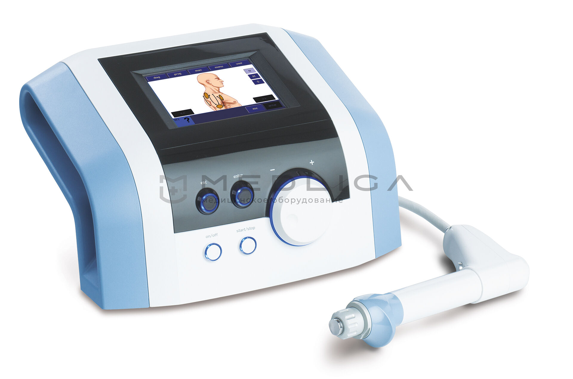 Еще одно преимущество – наличие программной части, значительно упрощающей работу с прибором. Он оснащен цветным экраном с сенсорным управлением, имеет встроенную базу диагнозов, для лечения которых используется. Также конструкция позволяет хранить картотеку пациентов. Это удобно с учетом того, что УВТ обычно назначается курсами.