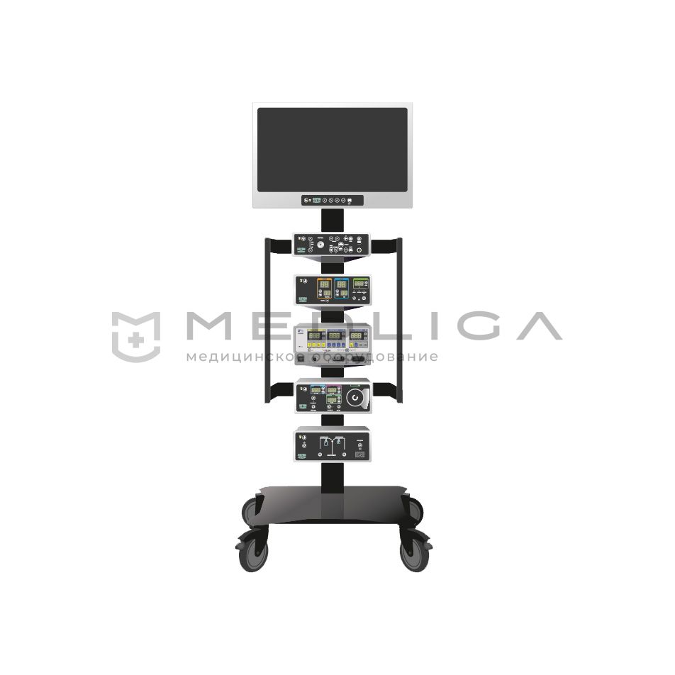 Стойка передвижная для эндоскопических аппаратов и устройств предназначена для установки и перемещения аппаратов и устройств для эндоскопической хирургии. Стойка выполнена из высококачественных материалов: алюминий, нержавеющая сталь. Данная модель стойки имеет 5 полок.
