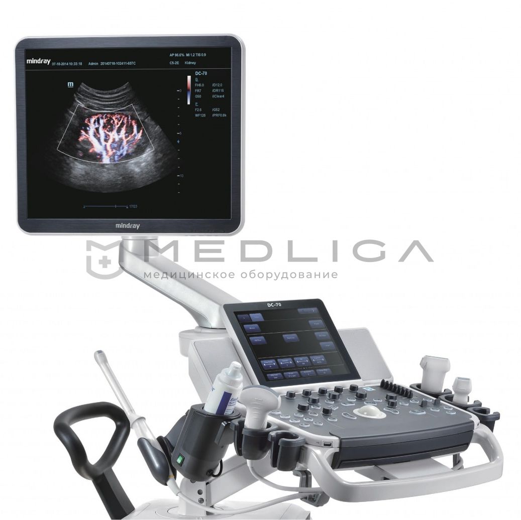 Mindray DC-70 – современная ультразвуковая система стационарного типа с чувствительным сенсорным дисплеем с диагональю 10,4 дюйма, а также удобным в эксплуатации жидкокристаллическим монитором с диагональю 19 дюймов на шарнирном кронштейне.
