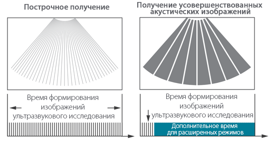 • Получение усовершенствованных акустических изображений.  С помощью передачи и получения сигналов от относительно небольшого количества крупных зон при создании усовершенствованных акустических изображений извлекается больше информации для каждого кадра и построение изображения происходит в 10 раз быстрее, чем при традиционном построчном способе формирования ультразвукового пучка.