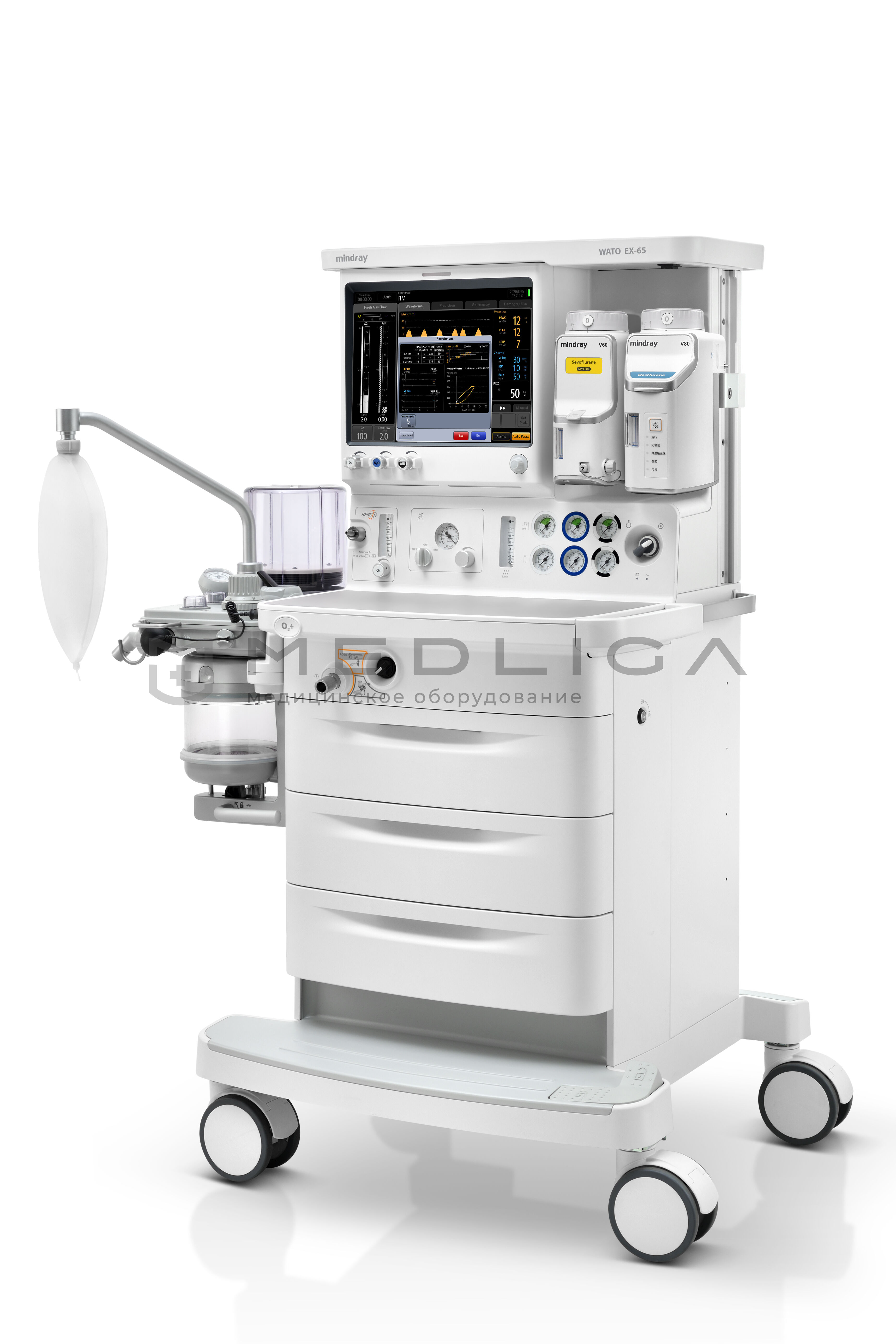 Оснащен интеллектуальной системой вентиляции и имеет расширенные возможности мониторинга. Наркозно-дыхательный аппарат WATO EX-65 поддерживает широкий спектр принудительных и вспомогательных режимов вентиляции: PCV-VG, SIMV-VG и многие другие, отвечая требованиям различных групп пациентов. Программное обеспечение для учета расхода анестетика и понятный интерфейс помогают правильно определить соотношение свежего газа и препарата, позволяя избежать излишнего расхода и связанных с ним экономических издержек.