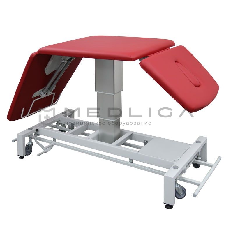 - Конструкция, которая предусматривает удобную регулировку высоты стола ногой с любой стороны посредством специального рамного переключателя, позволяет применять его с максимальным комфортом в самых различных областях медицины (ЛФК, кинезотерапия, мануальная терапия, массаж).