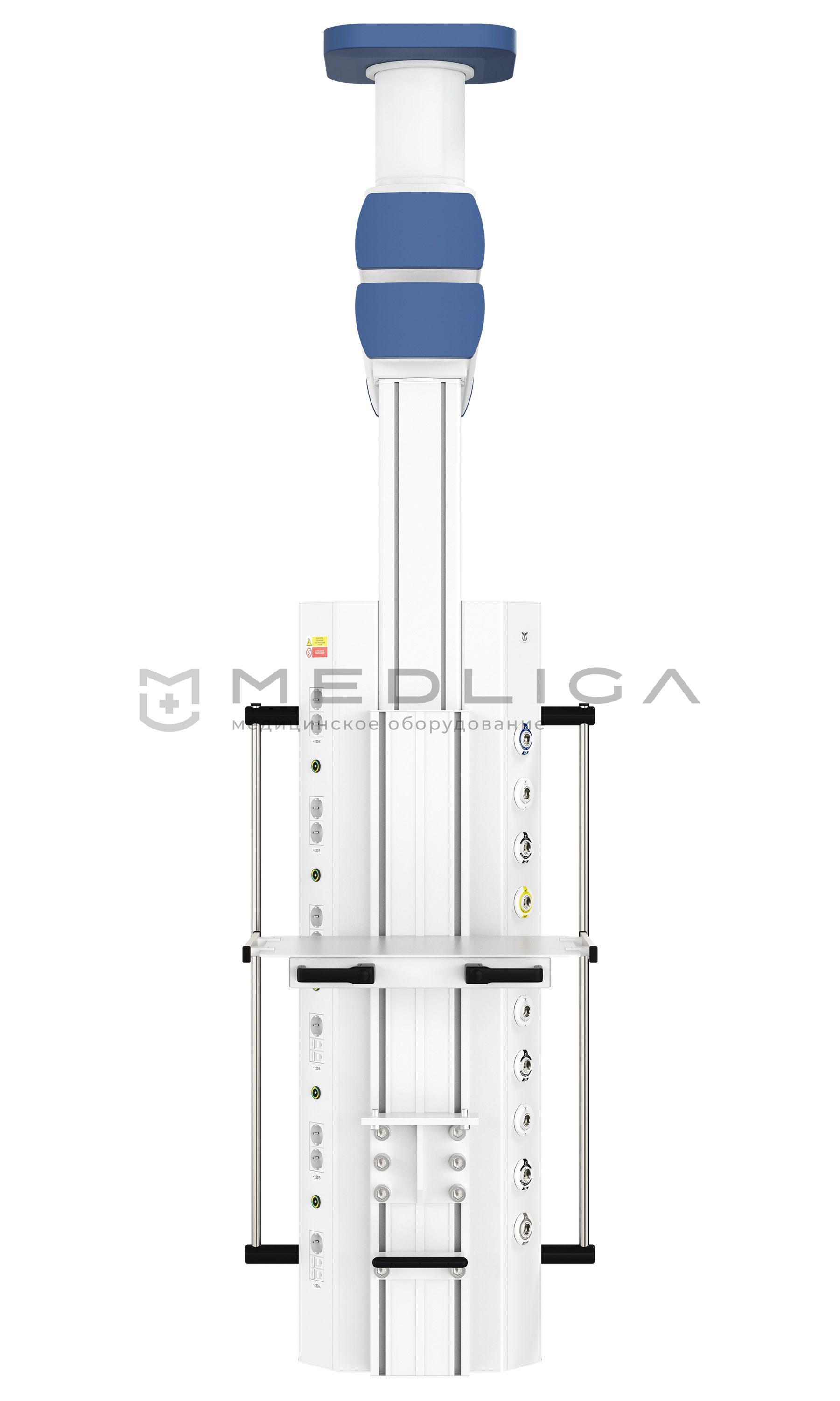 с 2-мя поворотными плечами, длиной до 1200 мм каждое, и вращающимся вертикальным шкафом источников медицинских газов и электропитания, позволяет эффективно организовать рабочее место медицинского персонала с возможностью свободного доступа к пациенту.