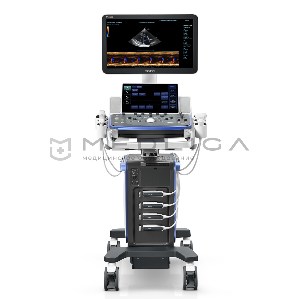 Vetus 7 — сочетание качественного изображения и комфортного рабочего процесса. Профессиональные пресеты ветеринарных исследований. Большой набор датчиков для ветеринарии и широкий кардиопакет.